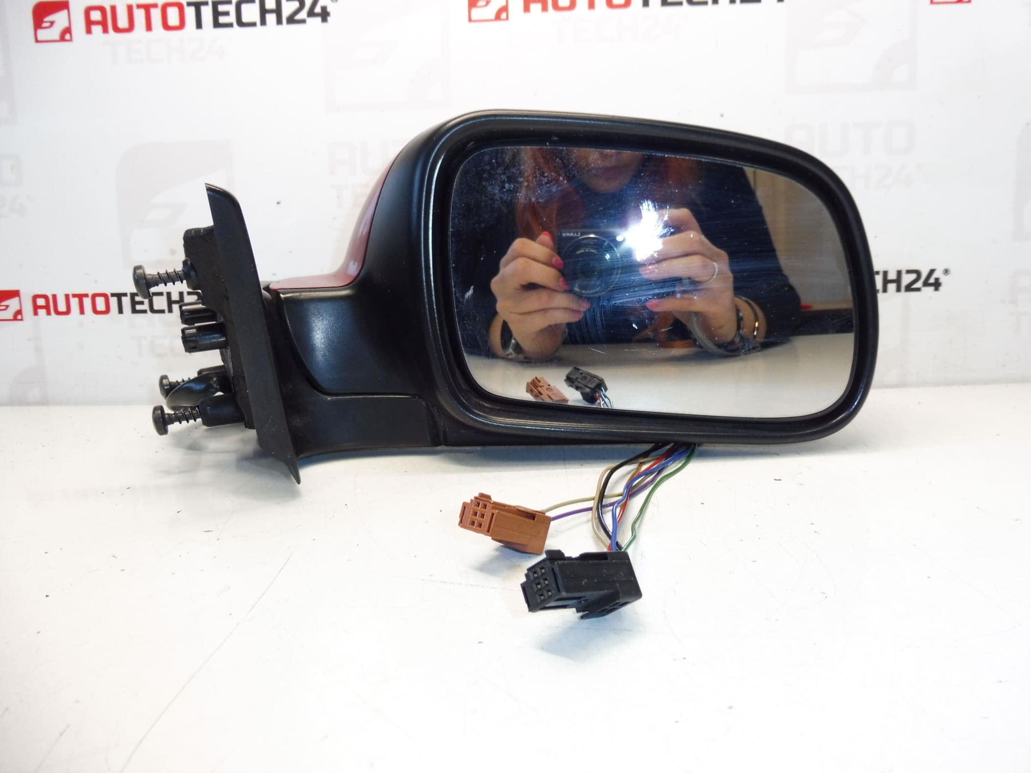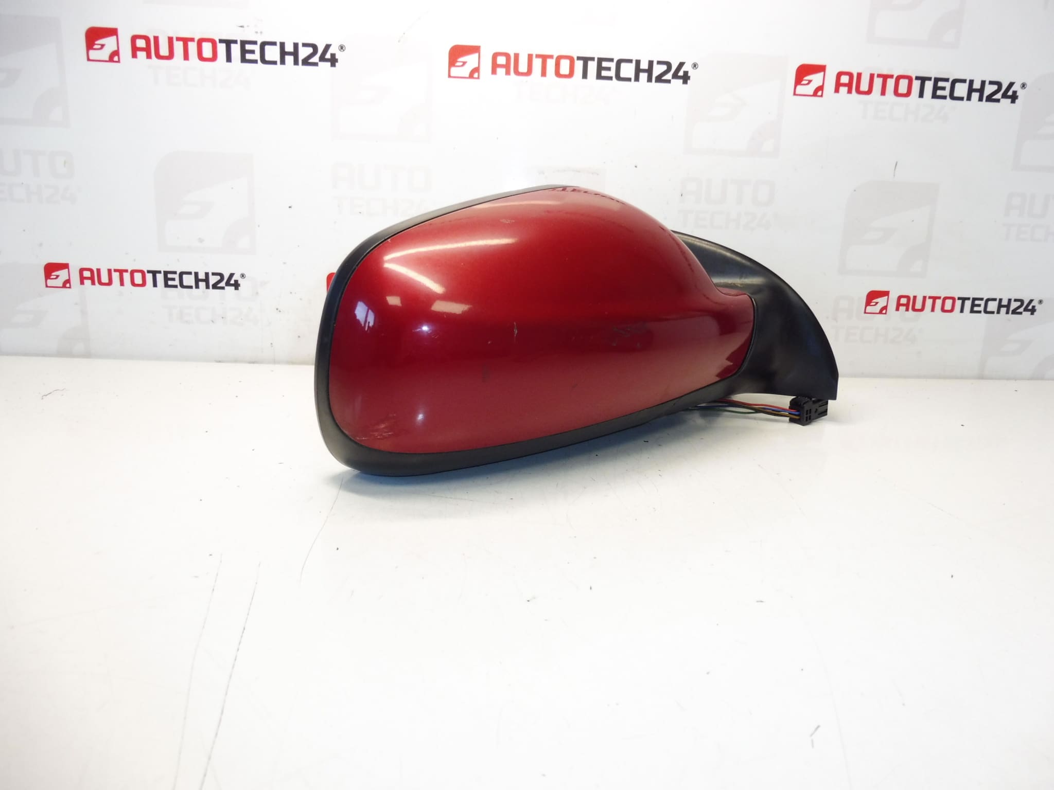 Vänster ytterbackspegel för föraren till Peugeot 307. Elektriskt styrd och uppvärmd, elektriskt infällbar mot bilen. Färg LKR – Lack Röd Babylone. 7 stift (5+2).